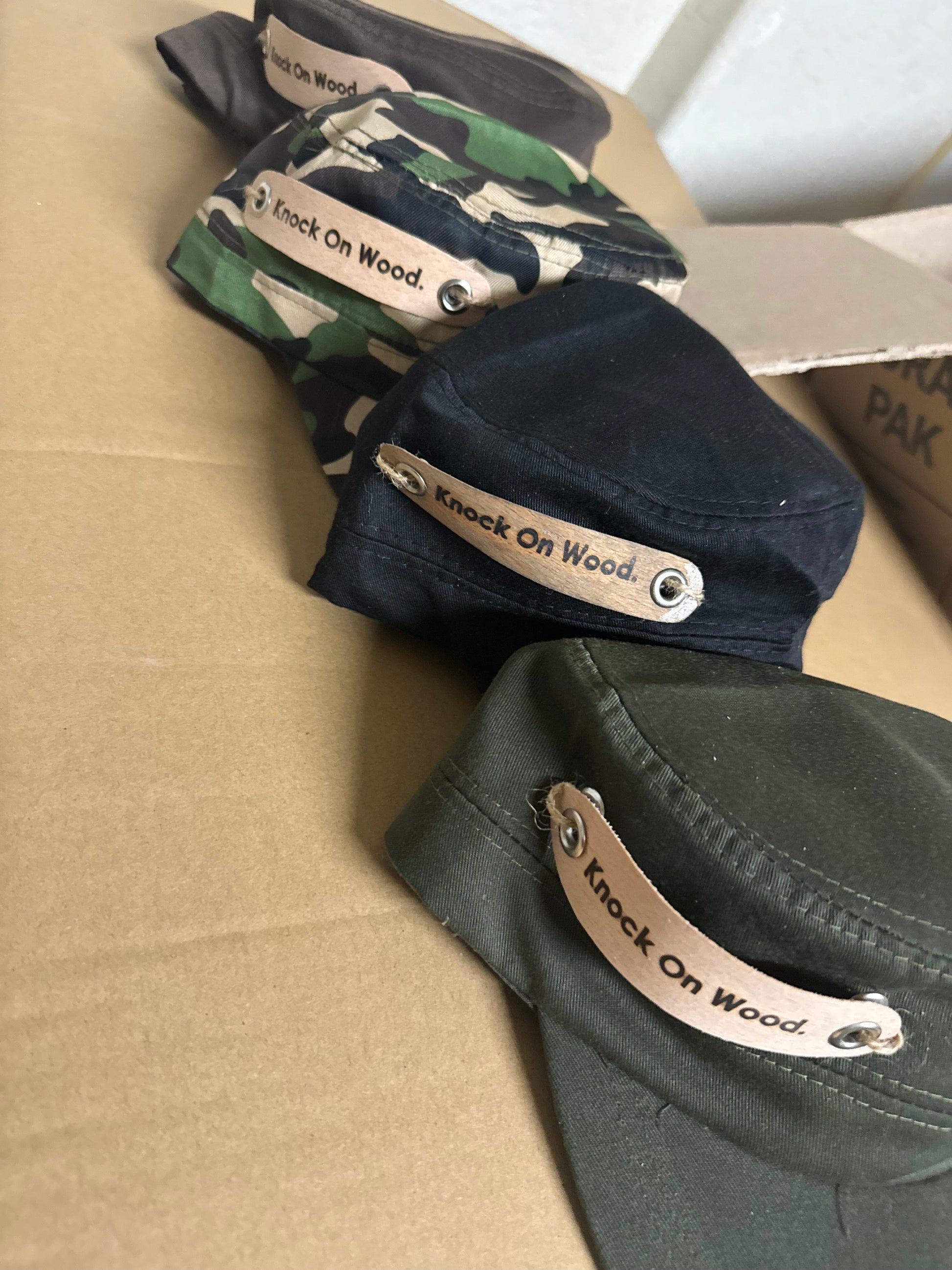 A wearable wink to the past — this hat features a small, tasteful strip of real wood attached into the brim or crown of the hat, paired with the classic phrase “Knock on Wood.” Inspired by the playful superstition many of our grandparents had — tapping their heads while saying “knock on wood” — this hat brings that tradition to life with style and charm. Whether you’re warding off bad luck or just love a quirky throwback, this hat lets you carry a little good fortune everywhere you go.